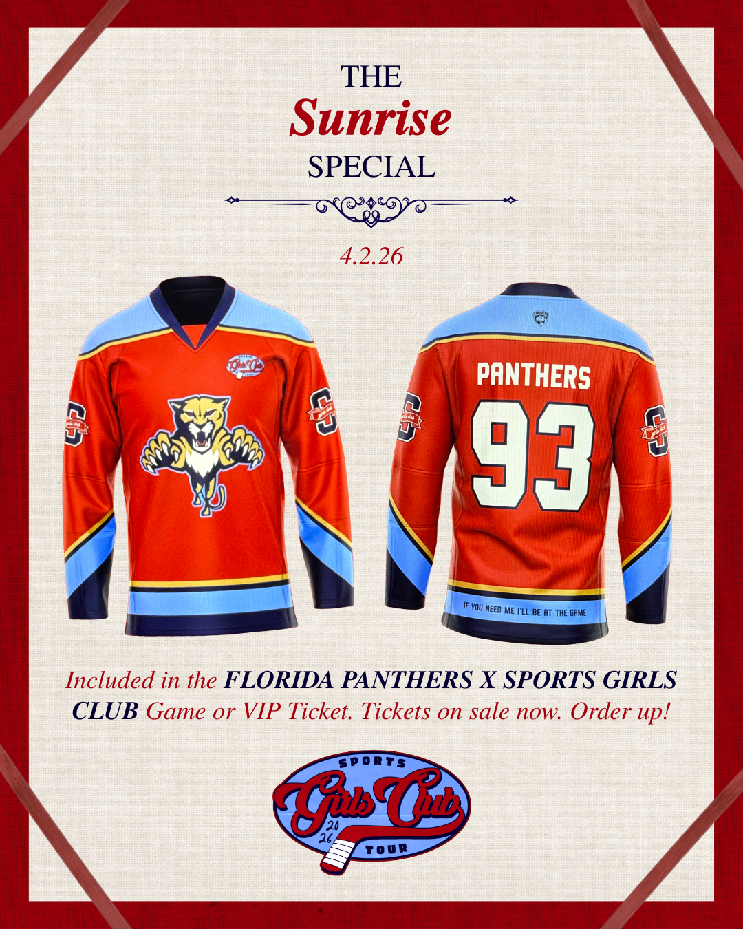 Sports Girls Club is teaming up with the Florida Panthers for a takeover game. Your game ticket will include access to the SGC activation on the concourse, a ticket to this game and an SGC X FL PANTHERS jersey. You will pick up your jersey at the game, first come first serve for sizing.